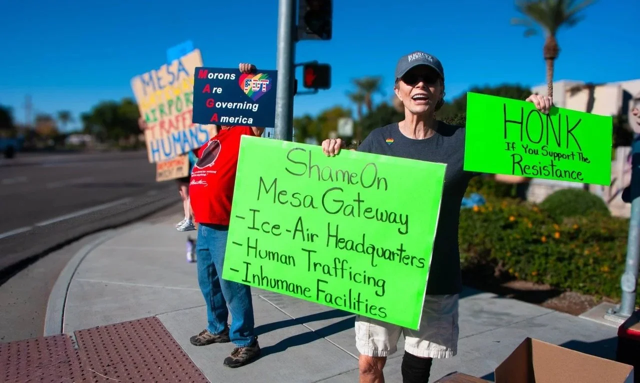 Mesa Valley Indivisible, Phoenix Metro Democratic Socialists, Party for Socialism & Liberation, East Valley Unite, LUCHA, Puente, MELT, Organized Power in Numbers, & more are combining efforts for a protest & march against ICE deportation flights & the AROCC detention center at Mesa Gateway Airport…